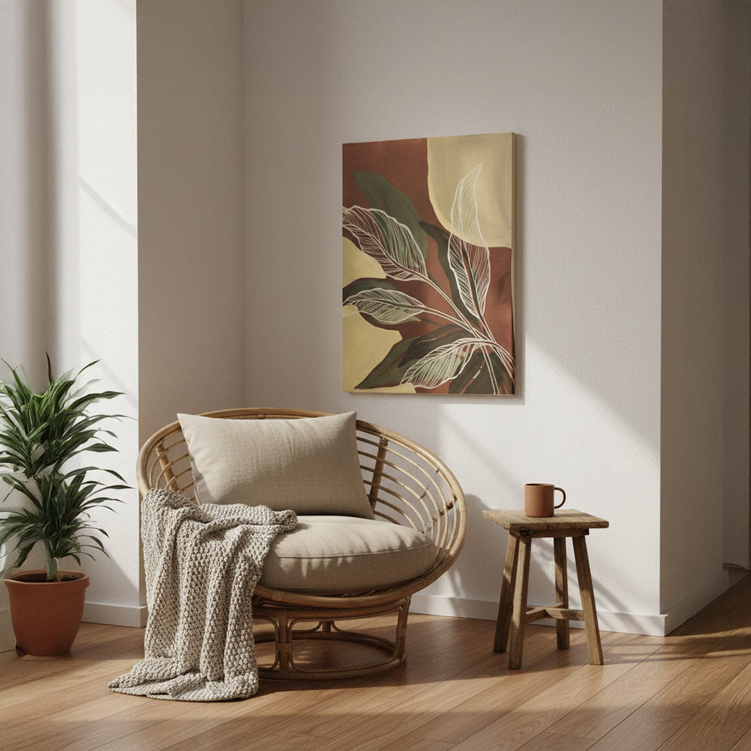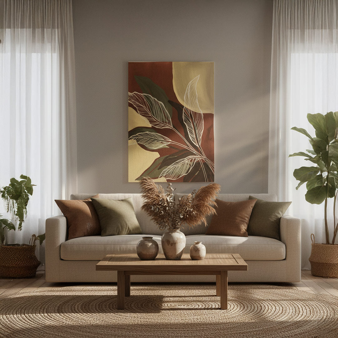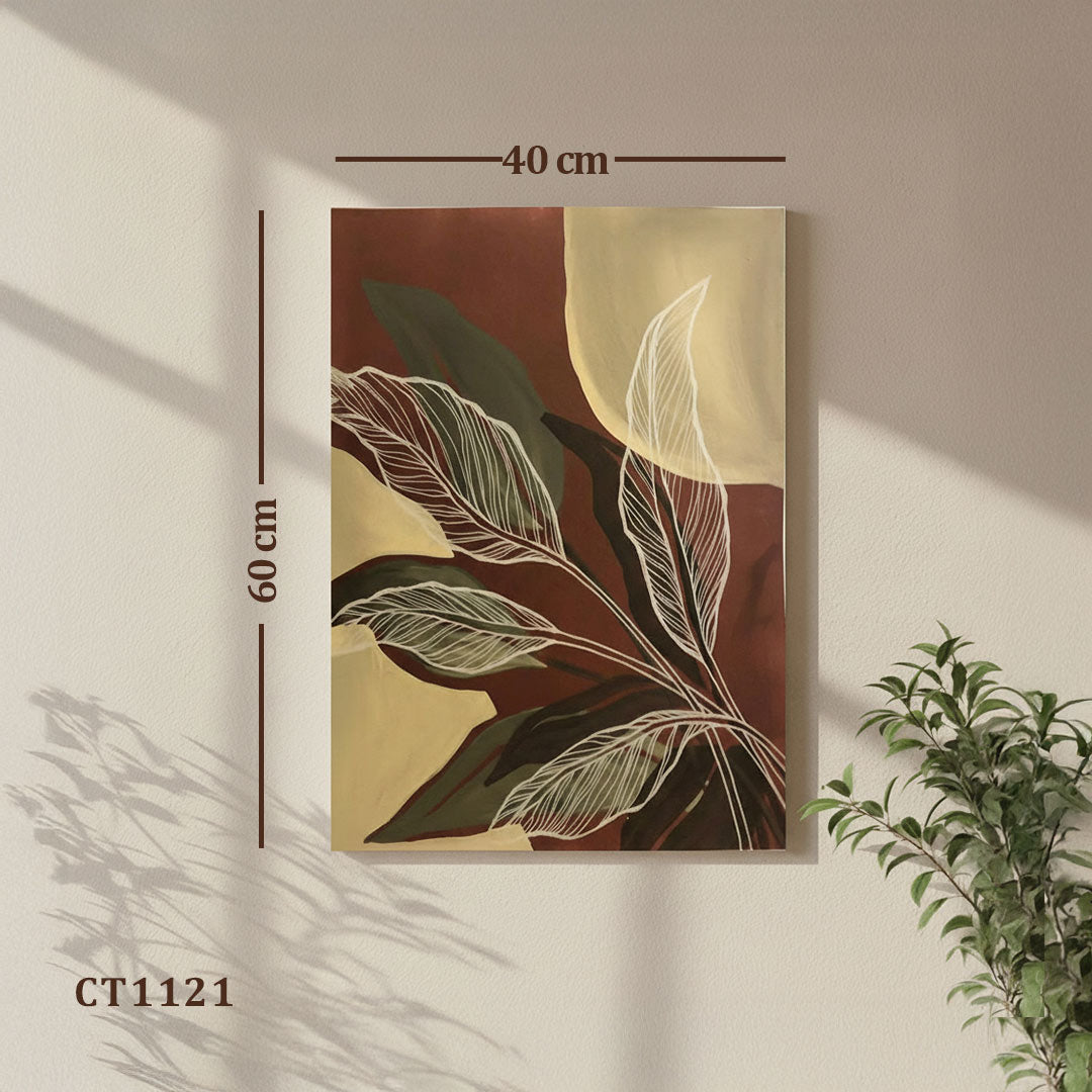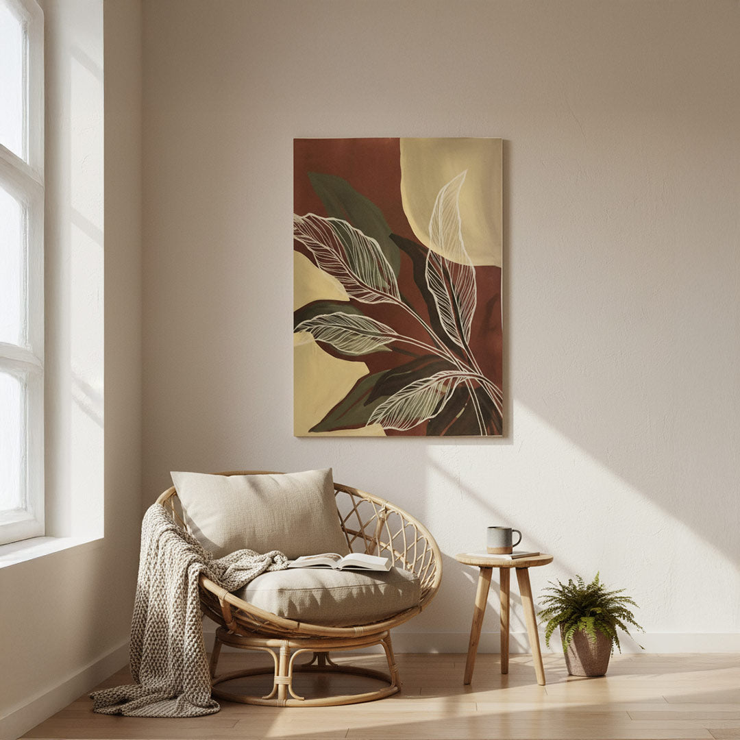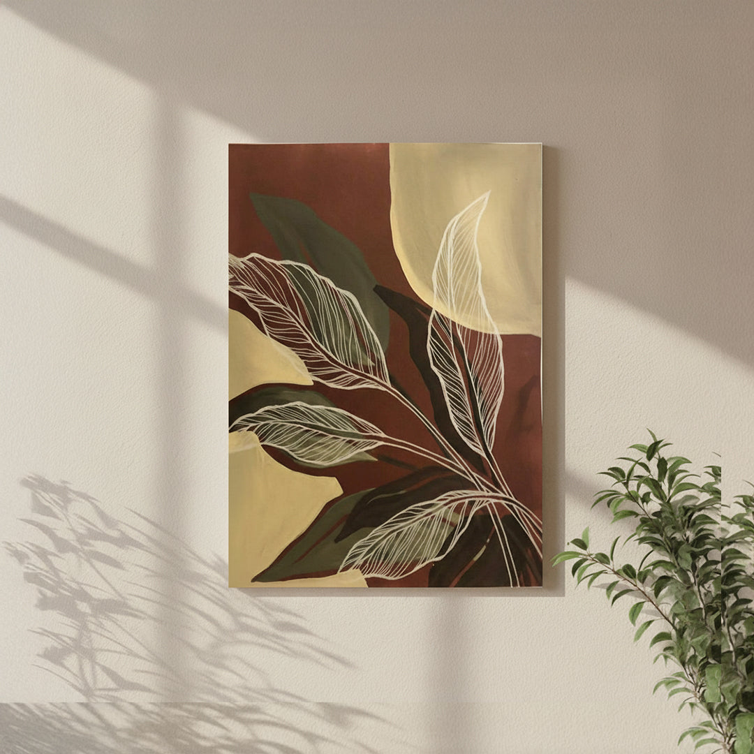 Bring warmth and organic elegance to your home with this botanical canvas artwork featuring delicate white leaf outlines over bold maroon, ochre, and forest green color blocks. A modern yet earthy piece perfect for nature-inspired interiors.