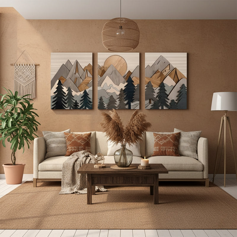 This stunning 3-piece artwork features elegant palm leaf designs in warm beige and brown tones, beautifully with natural wood for a modern yet earthy look.