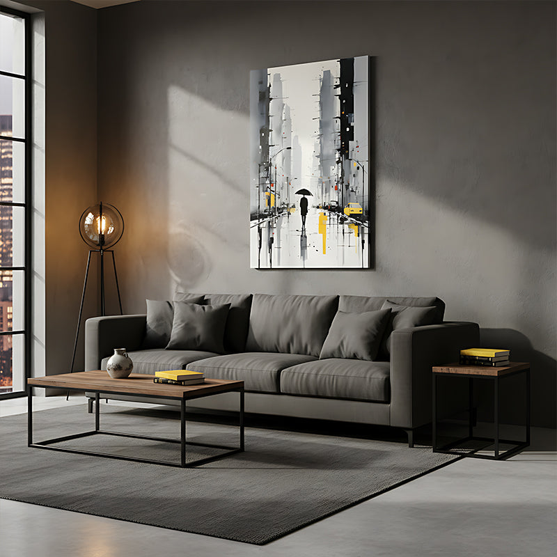 This modern artwork captures a rainy city scene with beautiful reflections and subtle splashes of yellow, creating a sense of calm and sophistication.