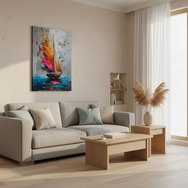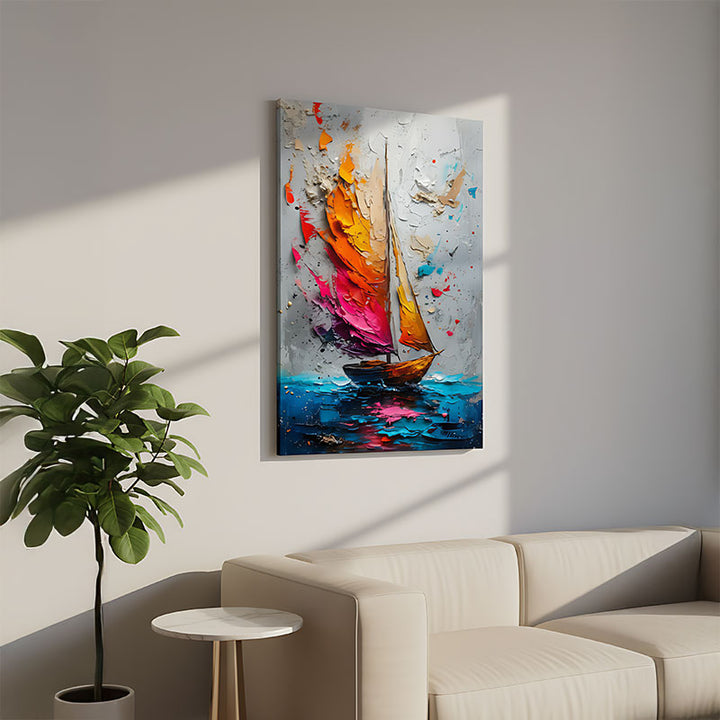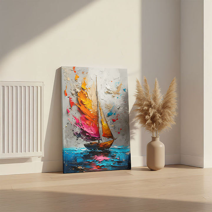 This vibrant artwork captures a sailing boat in bold, expressive tones that inspire freedom and movement.