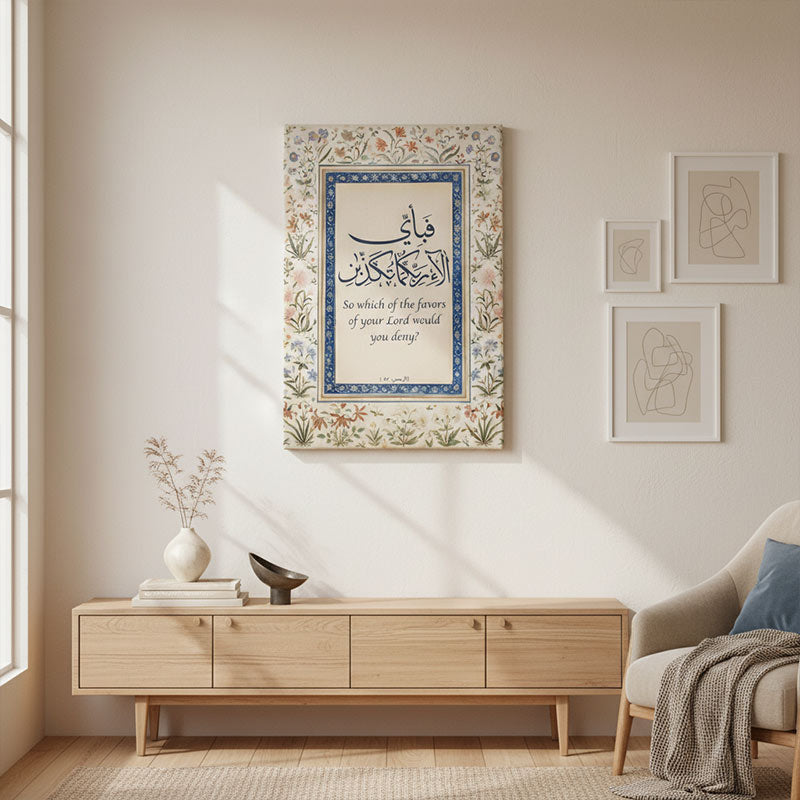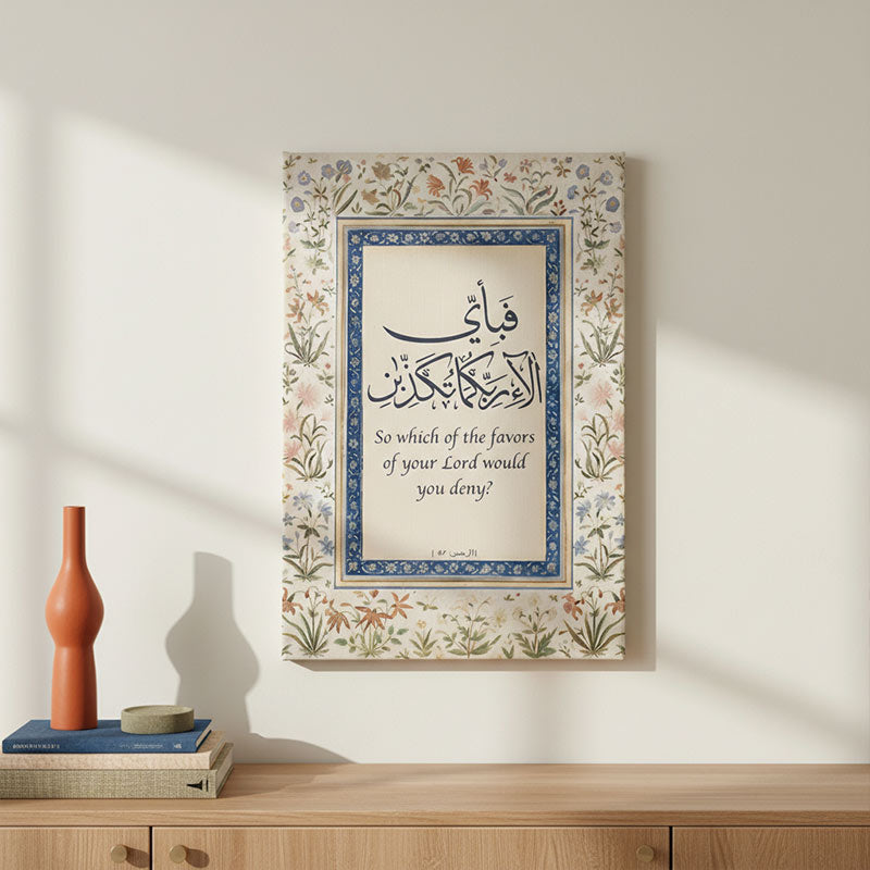 Add spiritual elegance to your space with this Islamic canvas featuring the verse “So which of the favors of your Lord would you deny?” beautifully framed with delicate floral details. A timeless reminder of gratitude and faith.