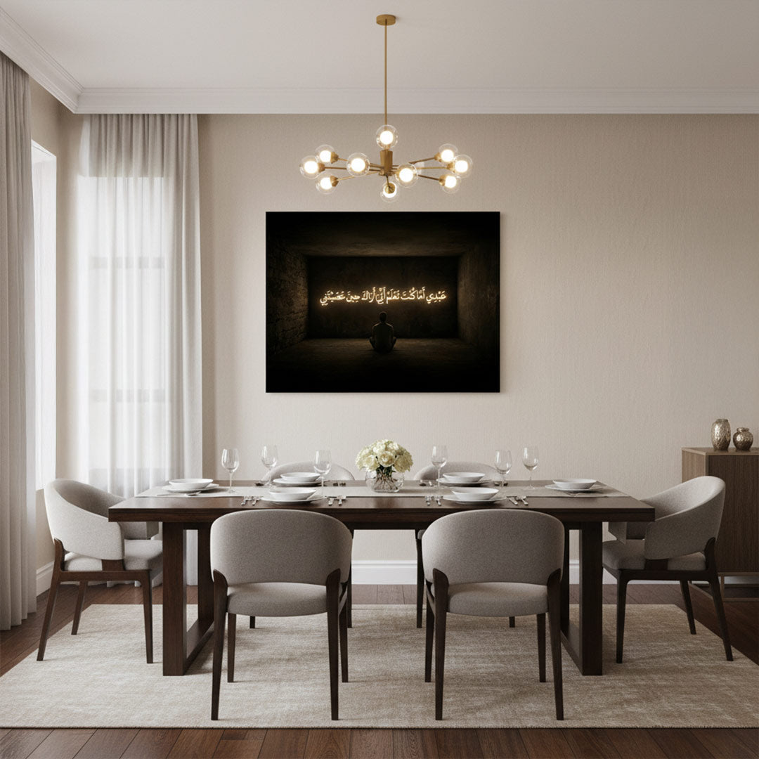 Immerse your space in spiritual depth with this powerful artwork featuring Arabic calligraphy in glowing script. The composition shows a lone figure illuminated in a dark room, symbolizing divine closeness even in solitude. Ideal for serene and meditative interiors.