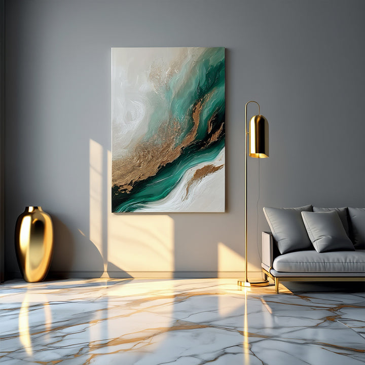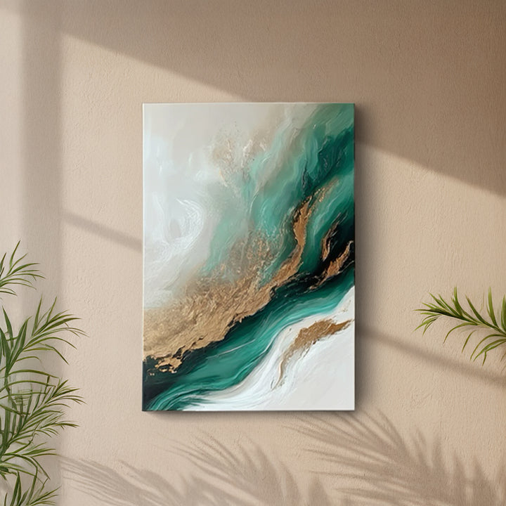 Bring calm and sophistication into your space with Emerald Drift Canvas. The fluid blend of emerald green, gold, and soft ivory creates a serene, luxurious vibe — perfect for modern interiors.