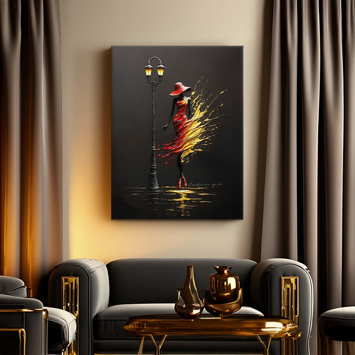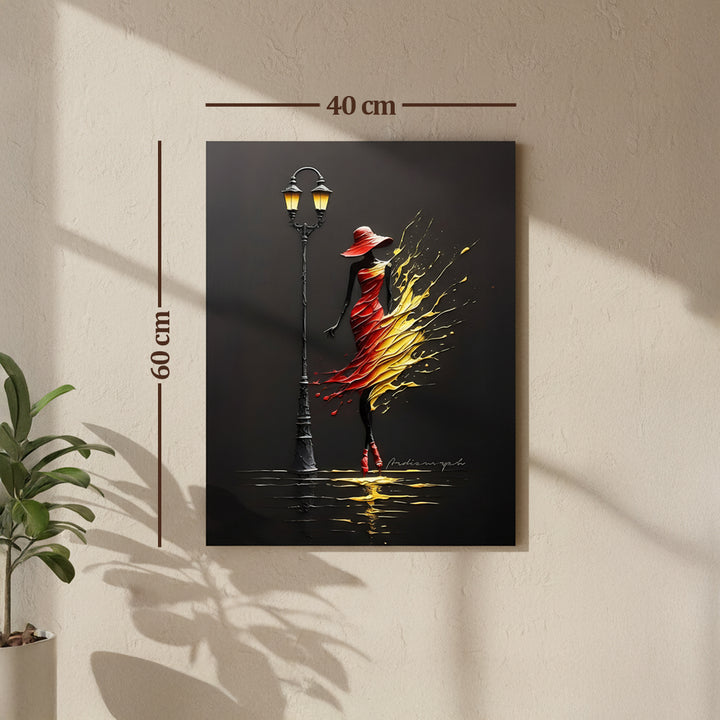 This stunning piece portrays a graceful woman in a flowing red and yellow dress that transforms into fiery motion under a glowing streetlight — symbolizing passion and confidence.