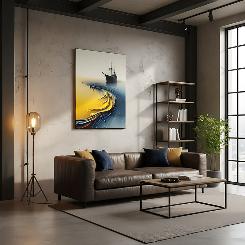 Add elegance and movement to your space with the Golden Horizon Ship Canvas. This mesmerizing artwork captures a classic ship sailing through a dramatic swirl of golden and navy hues — a perfect fusion of bold color and graceful flow.