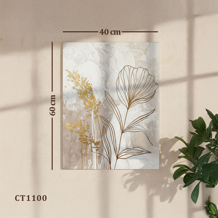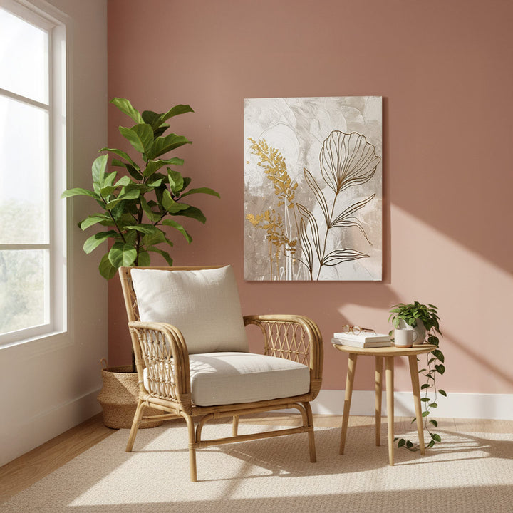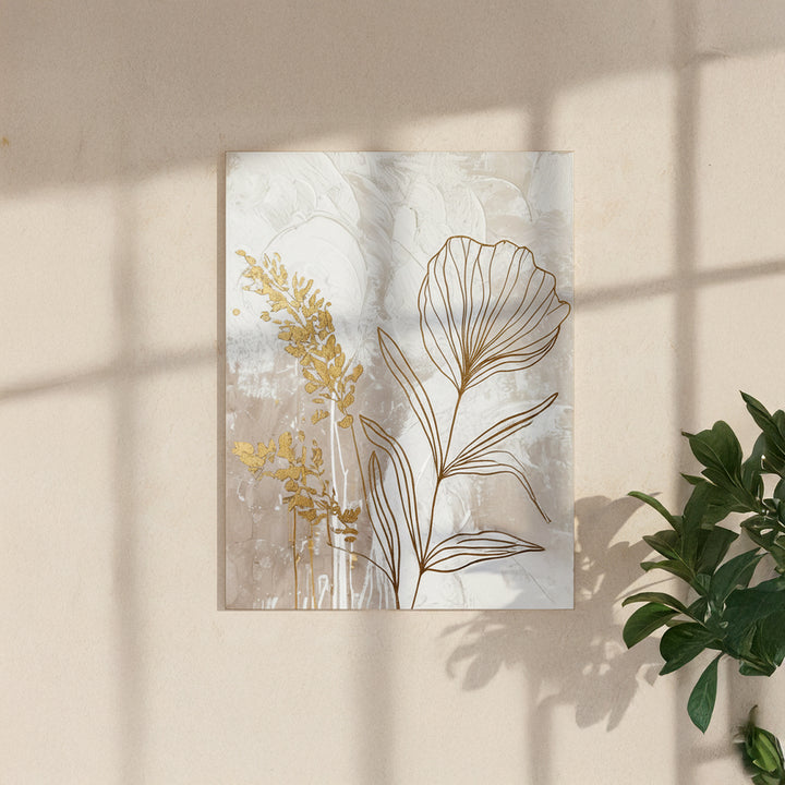 Delicate, modern, and timeless — the Golden Whispers Canvas features graceful golden floral outlines over soft beige and white tones. This piece blends minimalism with luxury, creating a peaceful yet refined atmosphere in any room.