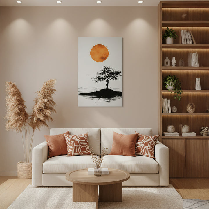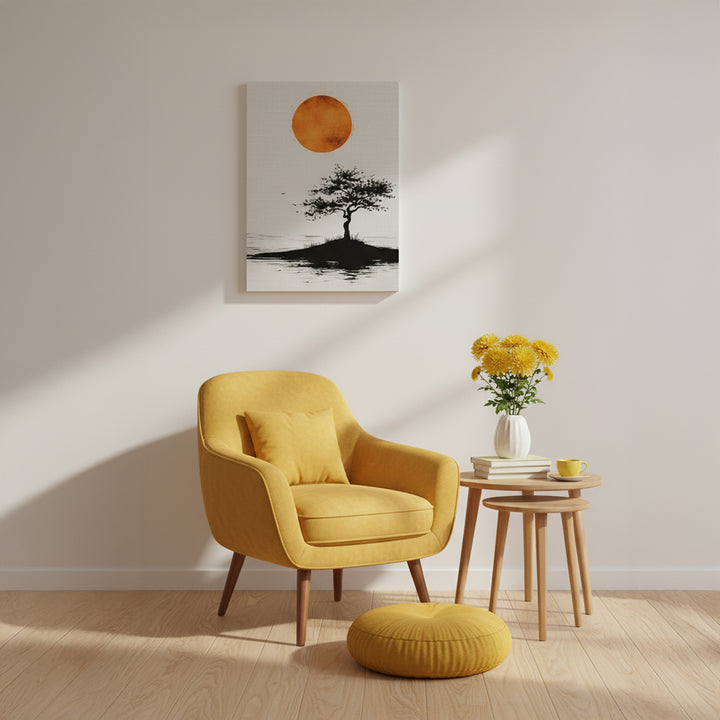This minimalist artwork captures the calm beauty of a golden sunset — a perfect balance between light, nature, and peace.