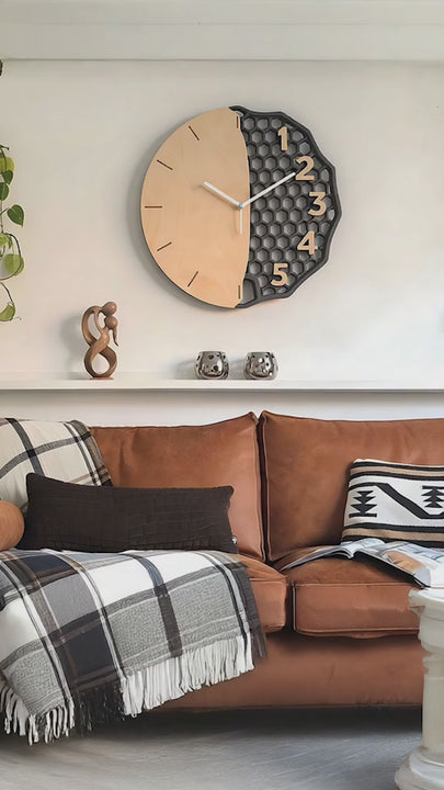 الجزء الخشبي الأملس يمنح شعورًا بالهدوء، بينما الإطار الأسود المنحوت يضيف جرأة وانسيابية مميزة، لتكون الساعة قطعة ديكور حديثة تلفت الأنظار وتُكمل أسلوبك الراقي.