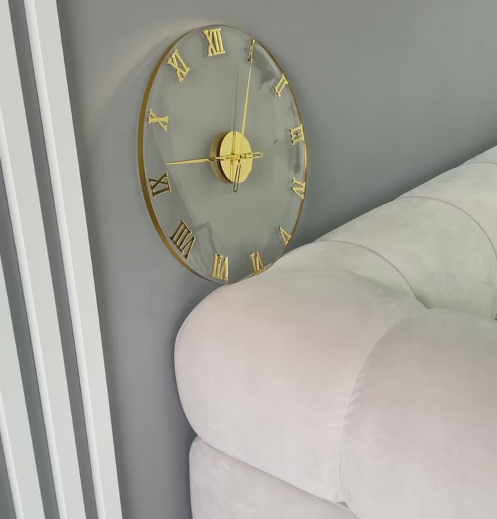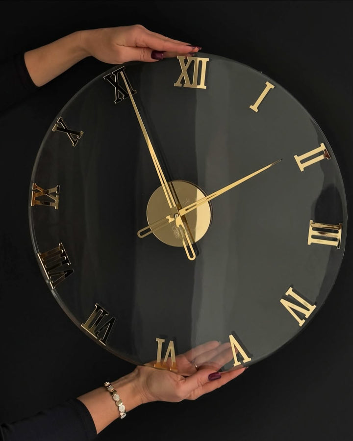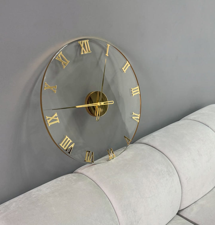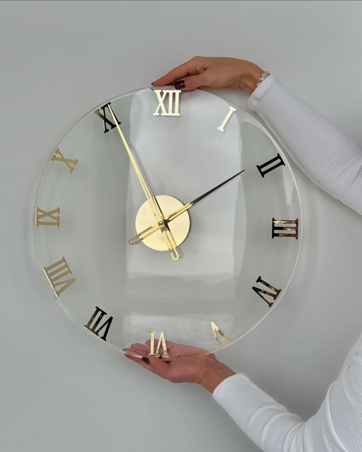 ساعة حائط أكريليك شفافة، مزودة بأرقام رومانية باللون الذهبي تضيف طابع كلاسيكي عصري يجمع بين الرقي والبساطة.