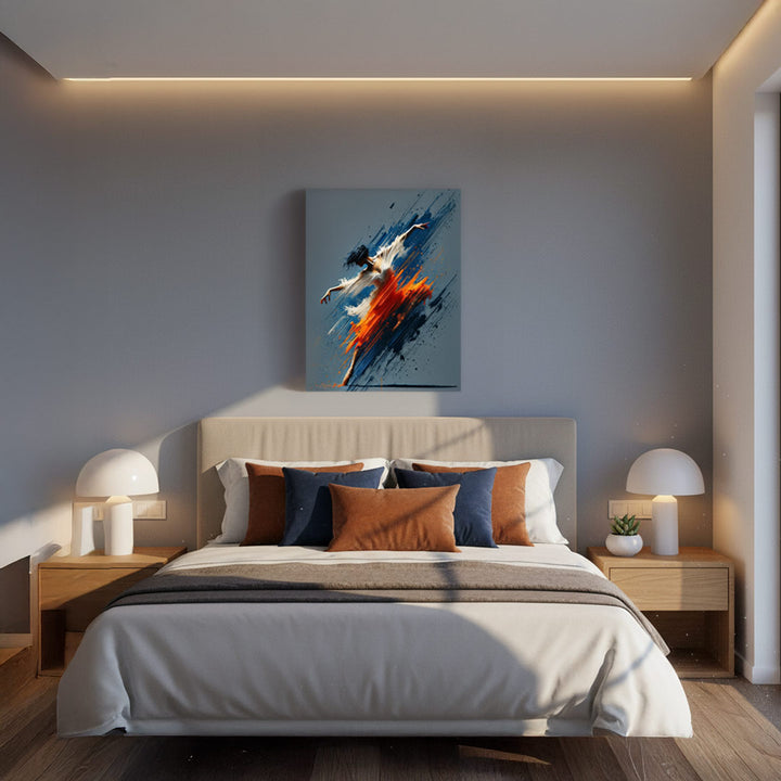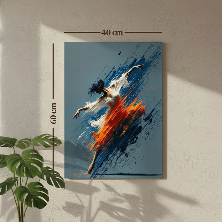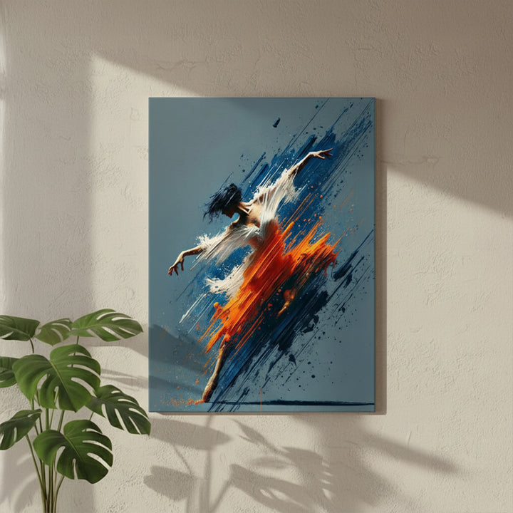 A stunning abstract artwork portraying a dancer mid-motion, blending bold strokes of fiery orange and deep blue to capture energy, freedom, and expression.