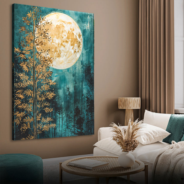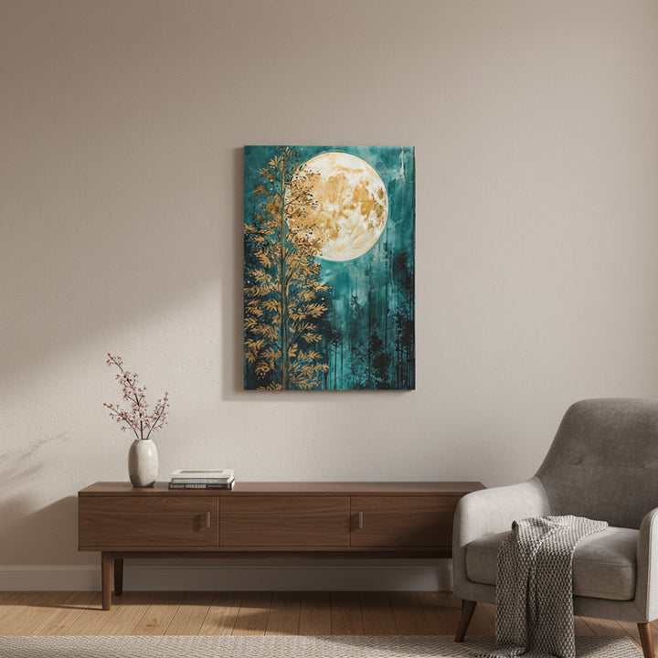 This elegant artwork features a glowing full moon over golden trees against deep teal tones — a perfect blend of mystery and tranquility.