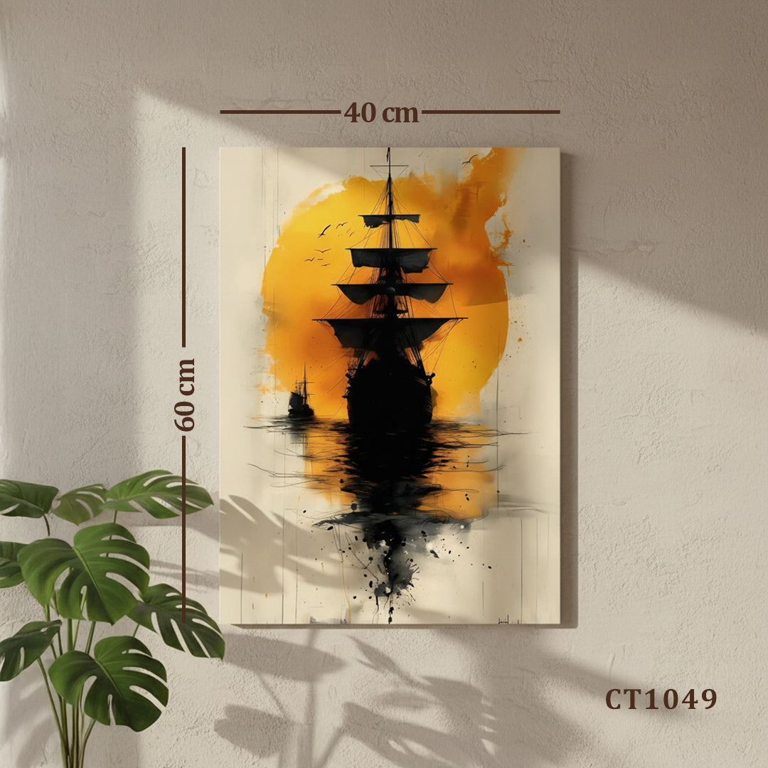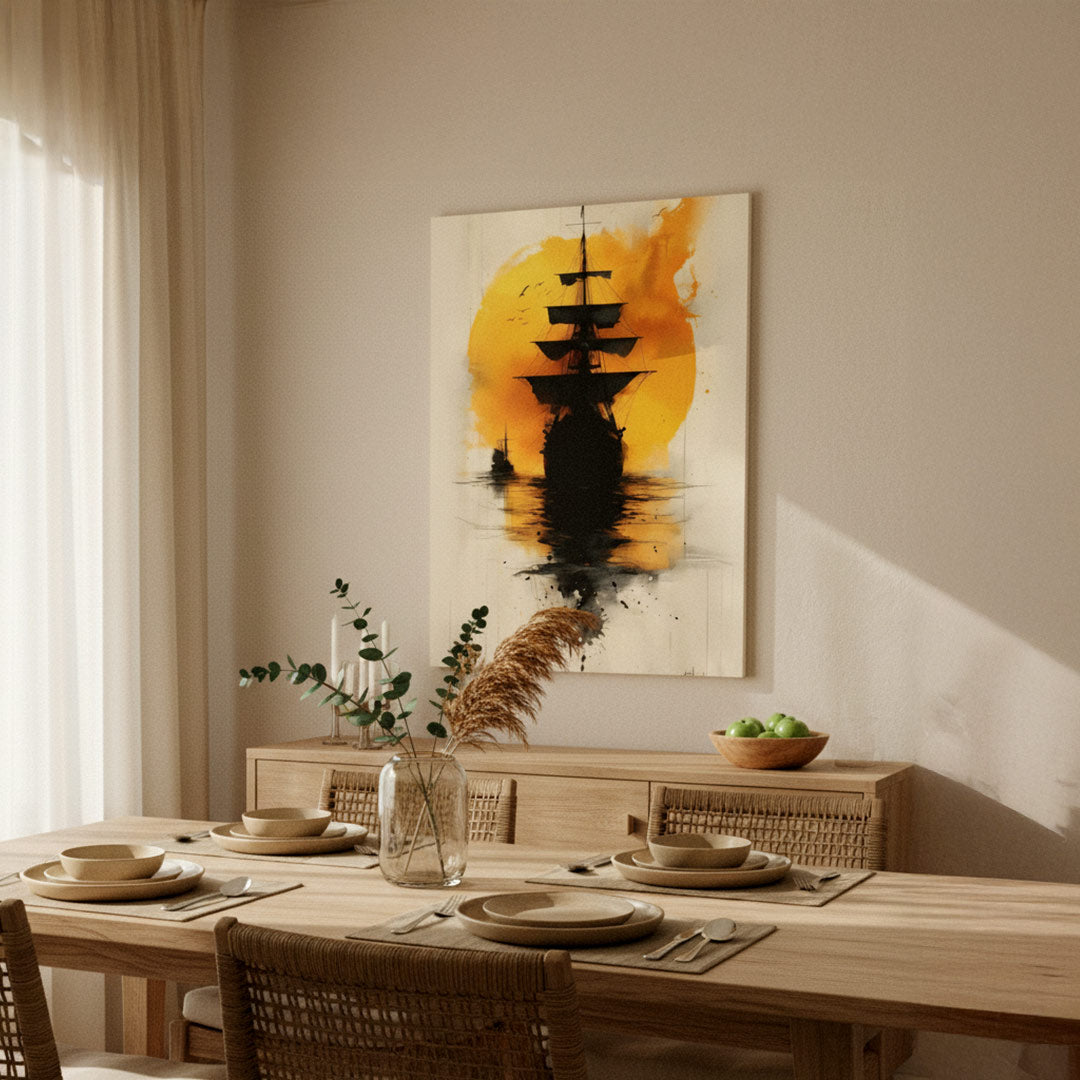 The silhouette of the ship against a glowing orange sun creates an emotional and timeless scene that brings energy and calm at once.