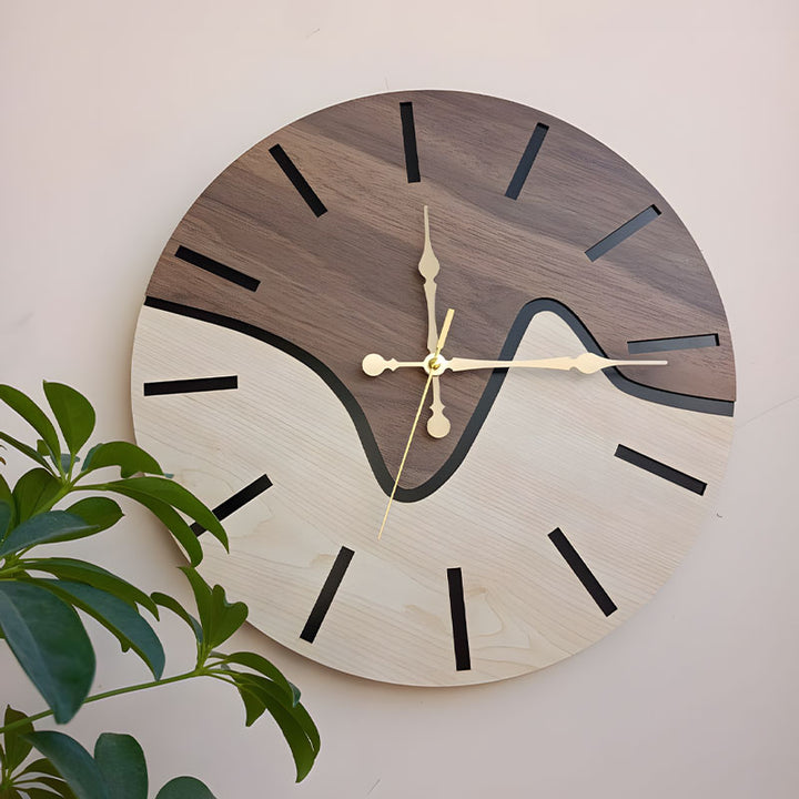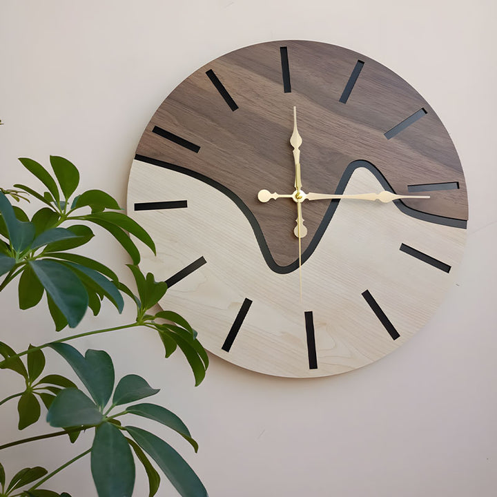 - الألوان: دمج بين الخشب الغامق والفاتح مع عقارب ذهبية