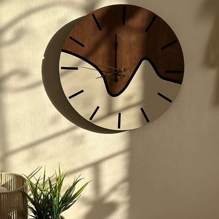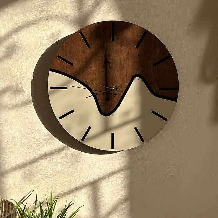 - الألوان: دمج بين الخشب الغامق والفاتح مع عقارب ذهبية